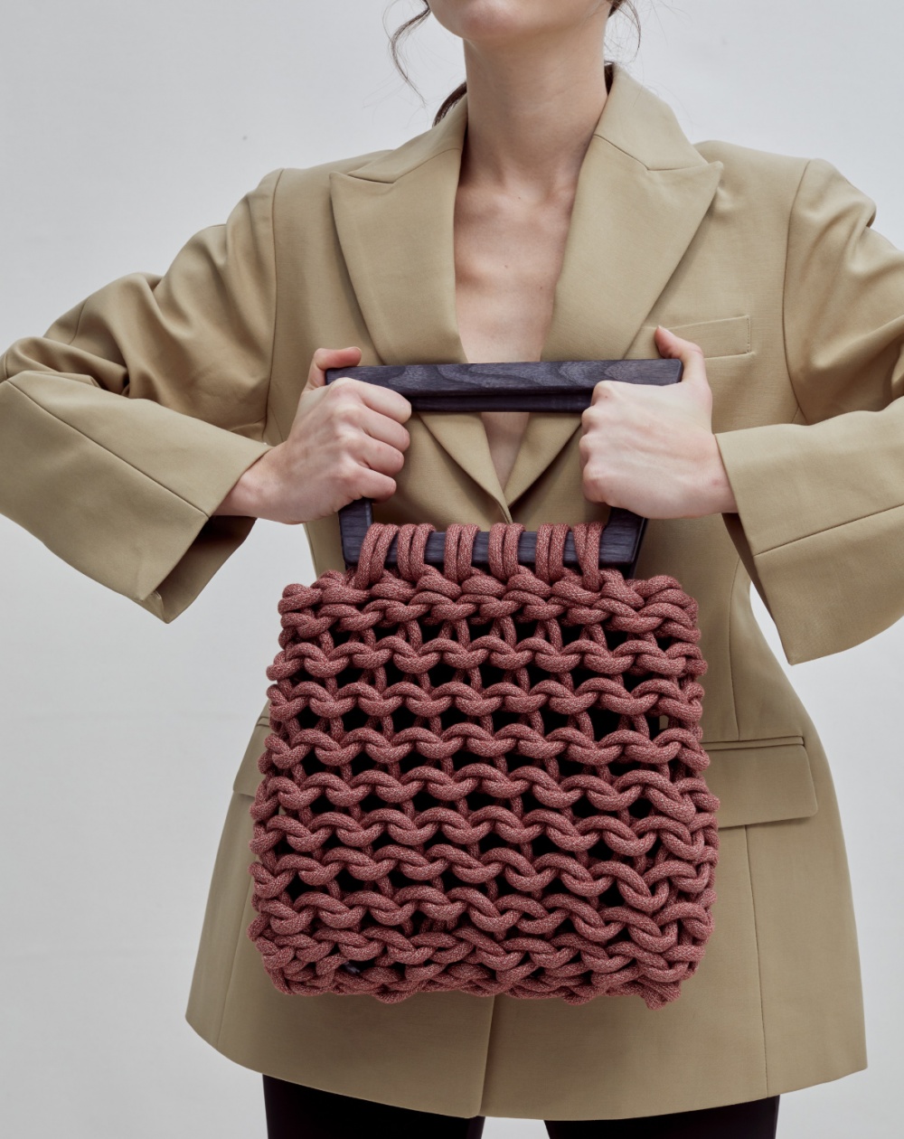 hand made bag realized with organic waxed cotton rope and oak wood handle